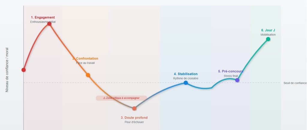 Après plus de trente ans d'expérience en tant que sapeur-pompier et plusieurs années à accompagner des candidats vers la réussite, j'ai observé que la préparation technique ne suffit pas. Comprendre les phases émotionnelles que vous allez rencontrer vous permet de mieux les traverser, de ne pas vous laisser déstabiliser, et surtout, de transformer ces moments en opportunités de progression.